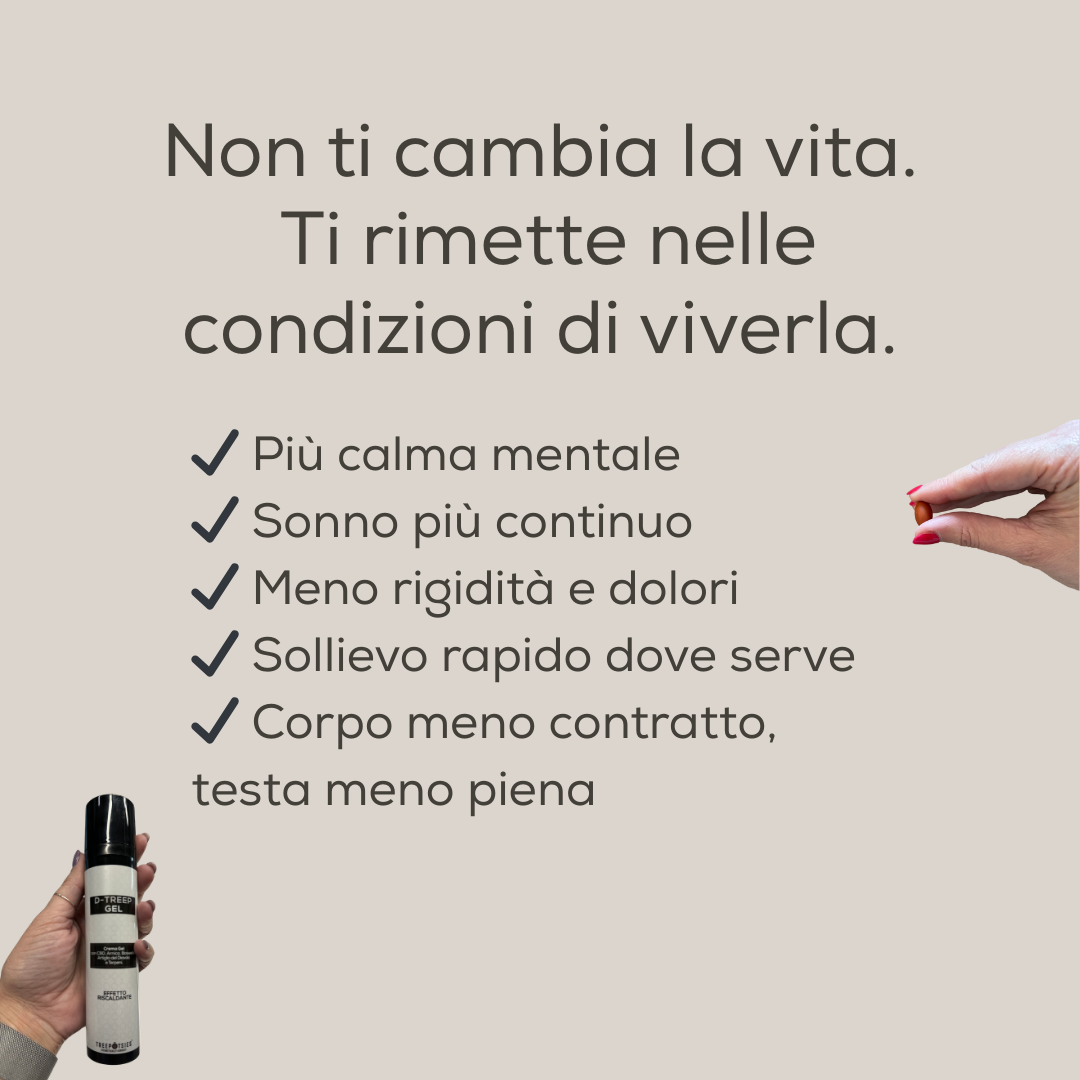 D-TREEP is a food supplement based on Hemp Seed Oil and Ginger Extract, ingredients of plant origin useful for articular functionality and to fight against localised states of tension. Enriched with a mix of Vitamins, D-TREEP is formulated with: