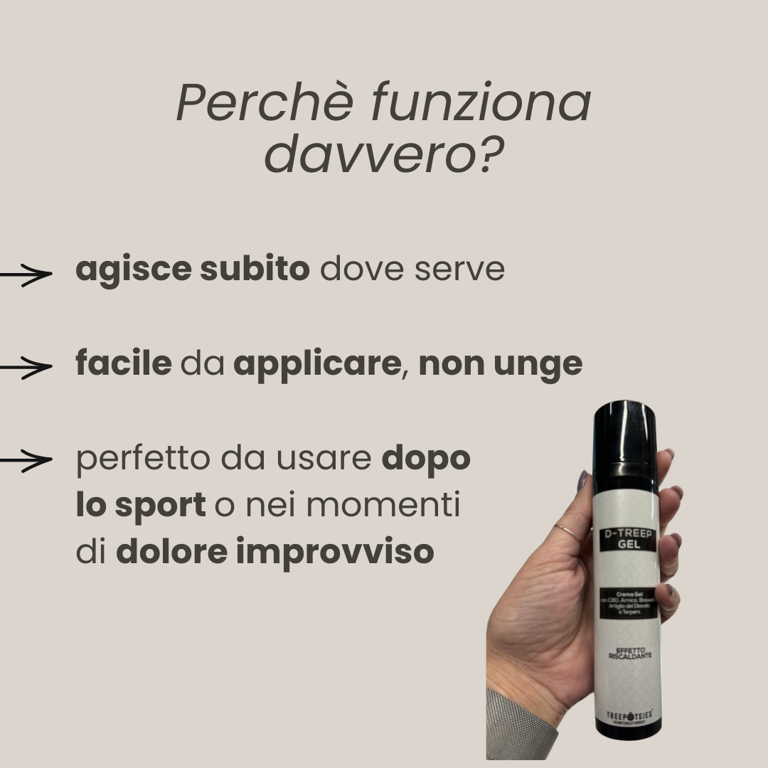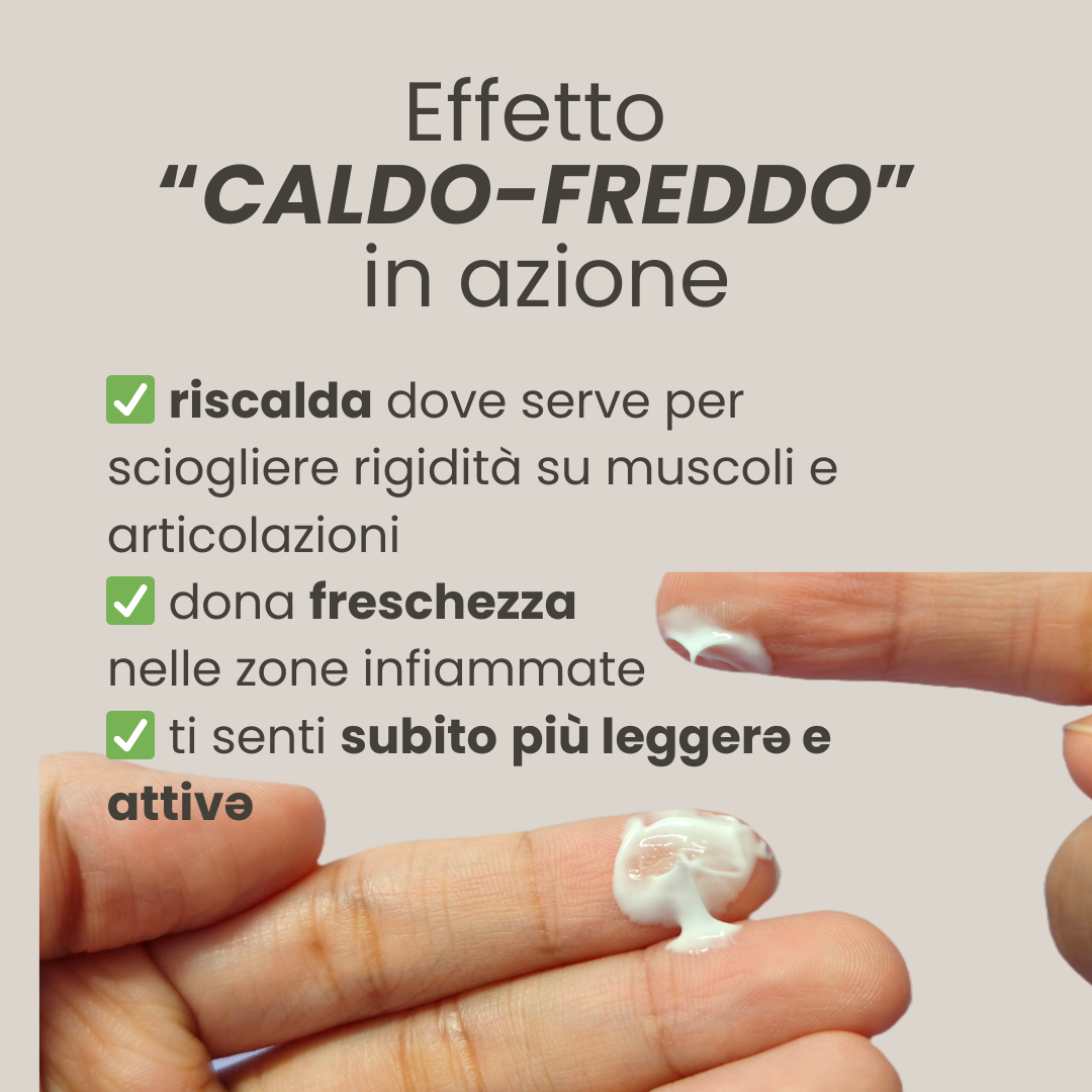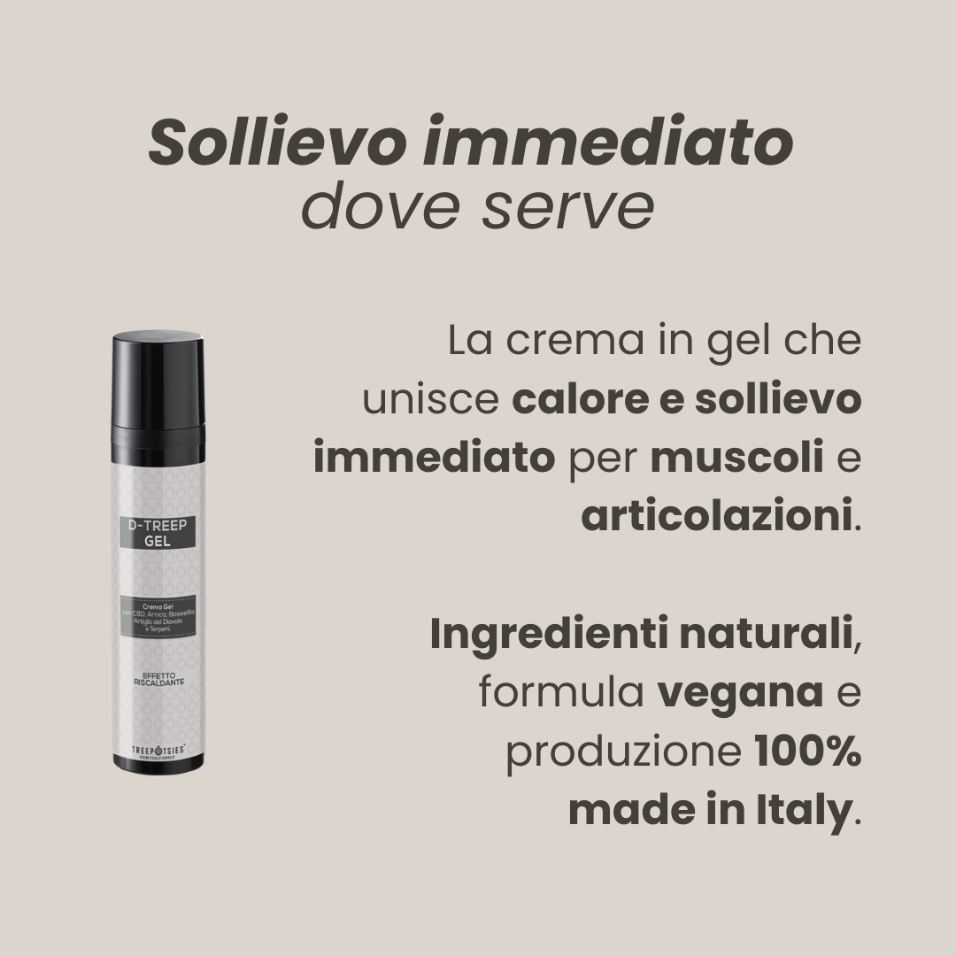 A gel-cream with warming effect ideal for muscular and joint pain. The CBD and Devil’s Claw in the formula have anti-inflammatory and antioxidant properties. Arnica and Boswellia provide soothing e ects, while Camphor and Menthol together create a beneficial “hot/cold” synergy that helps the skin absorb the active ingredients.
