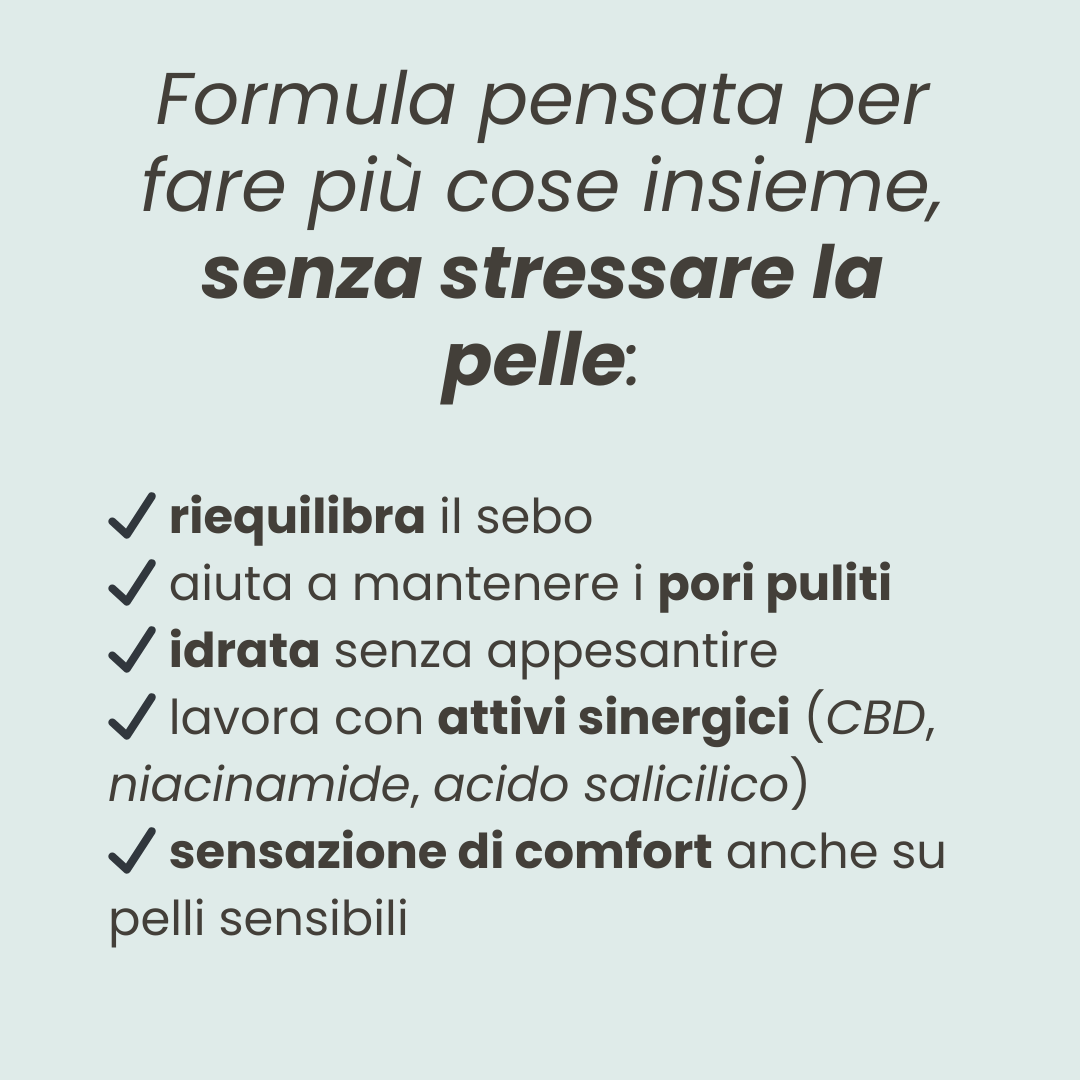 The Niacinamide and the Salicylic Acid in the formula help to reduce acne, normalize the texture of the skin and to reduce both white and black spots. The CBD improves the regulation of sebum production in the skin.The Hyaluronic Acid maintains the skin highly hydrated. The Terpene in this product is the Beta-Caryophyllene, extracted from Clove Essential Oil.