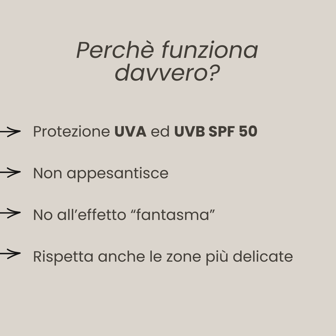Il filtro solare SPF50 protegge la pelle dai raggi UVA ed UVB.
